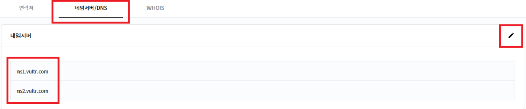 네임서버/DNS 클릭 - 오른쪽 연필 아이콘 클릭하셔서 네임서버 변경을 할 수 있습니다.