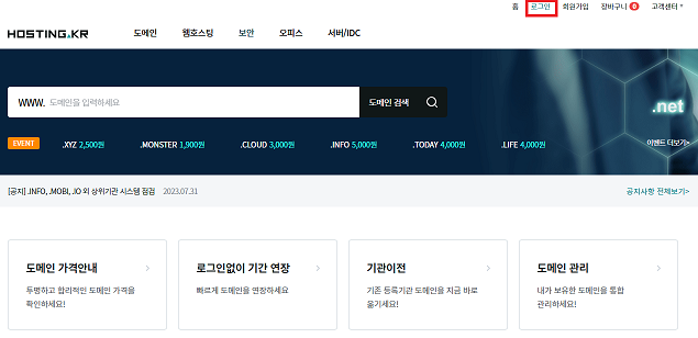 호스팅 케이알 홈페이지에 접속하여 로그인합니다.
