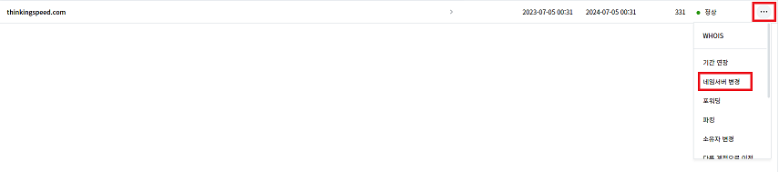 사이트 오른쪽에 점 3개 눌러주면 아래에 네임서버 변경 항목이 보입니다.