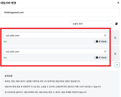 저는 벌처(Vultr)를 이용하기에 벌처의 네임서버가 등록이 되어있네요.